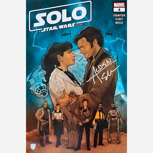 12x18 Solo: A Star Wars Story photo signed by Alden Ehrenreich in November of 2021 in Los Angeles, CA, and by Emilia Clarke in December of 2021 in London, UK. This comes with our numbered hologram COA sticker for authenticity.