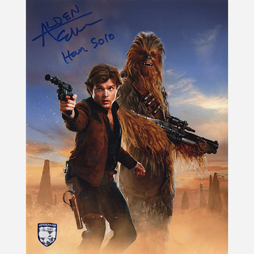 8x10 Solo: A Star Wars Story photo of Han Solo & Chewbacca signed by Alden Ehrenreich with Character Name in November of 2021 in Los Angeles, CA. This comes with our numbered hologram COA sticker for authenticity.