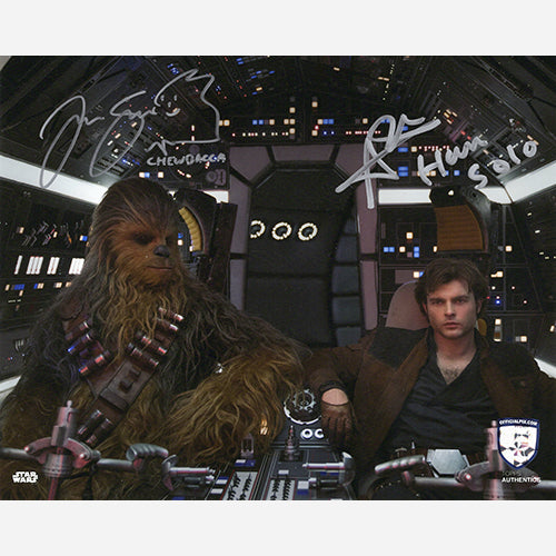 Officially licensed 8x10 Solo: A Star Wars Story photo of Han Solo & Chewbacca signed by Alden Ehrenreich in February of 2020 in Beverly Hills, CA, and by Joonas Suotamo in May of 2022 in Anaheim, CA, both with Character Names. This comes with our numbered hologram COA sticker for authenticity.