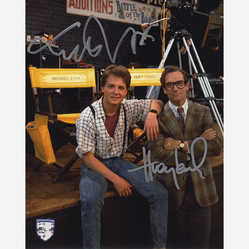 8x10 Back to the Future photo of Marty McFly & the High School Band Audition Judge signed by Huey Lewis in July of 2021 in Missoula, MT, and by Michael J. Fox in October of 2022 in New York City, NY. This comes with our numbered hologram COA sticker for authenticity.