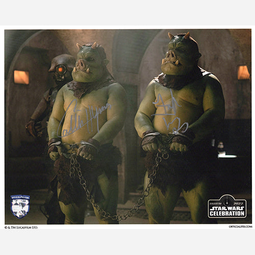 Officially licensed Star Wars Celebration Anaheim 2022 8x10 Star Wars: The Book of Boba Fett photo of Gamorrean Guards signed by Collin Hymes & Frank Trigg in May of 2022 in Anaheim, CA. This comes with our numbered hologram COA sticker for authenticity.