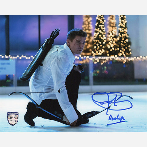 8x10 Hawkeye photo of Clint Barton signed by Jeremy Renner with Character Name in April of 2022 in Sherman Oaks, CA. This comes with our numbered hologram COA sticker for authenticity.