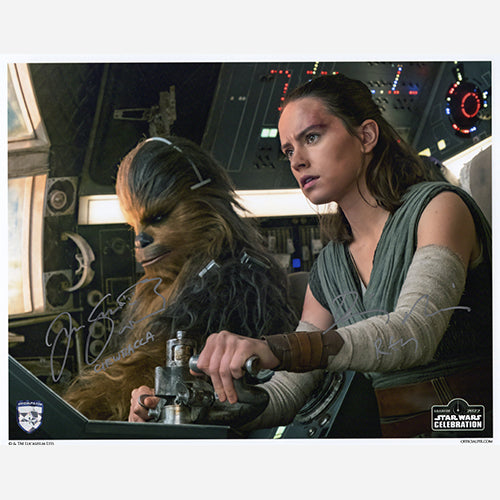 Officially licensed Star Wars Celebration Anaheim 2022 11x14 Star Wars: The Last Jedi photo of Chewbacca & Rey signed by Joonas Suotamo in May of 2022 in Anaheim, CA, and by Daisy Ridley in June of 2022 in Beverly Hills, CA, both with Character Names. This comes with our numbered hologram COA sticker for authenticity.