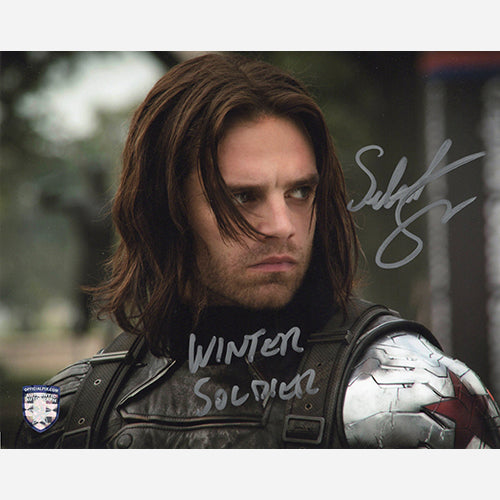 8x10 Captain America: The Winter Soldier photo of the Winter Soldier signed by Sebastian Stan with Character Name in November of 2021 in New York City, NY. This comes with our numbered hologram COA sticker for authenticity.