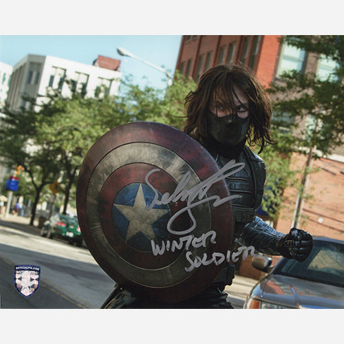 8x10 Captain America: The Winter Soldier photo of the Winter Soldier signed by Sebastian Stan with Character Name in November of 2021 in New York City, NY. This comes with our numbered hologram COA sticker for authenticity.