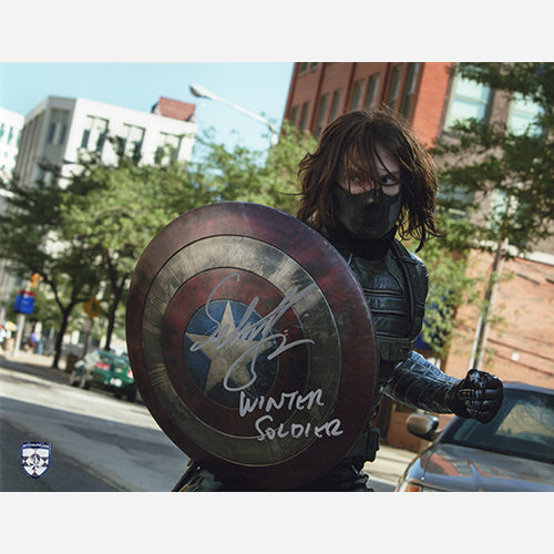 11x14 Captain America: The Winter Soldier photo of the Winter Soldier signed by Sebastian Stan with Character Name in November of 2021 in New York City, NY. This comes with our numbered hologram COA sticker for authenticity.